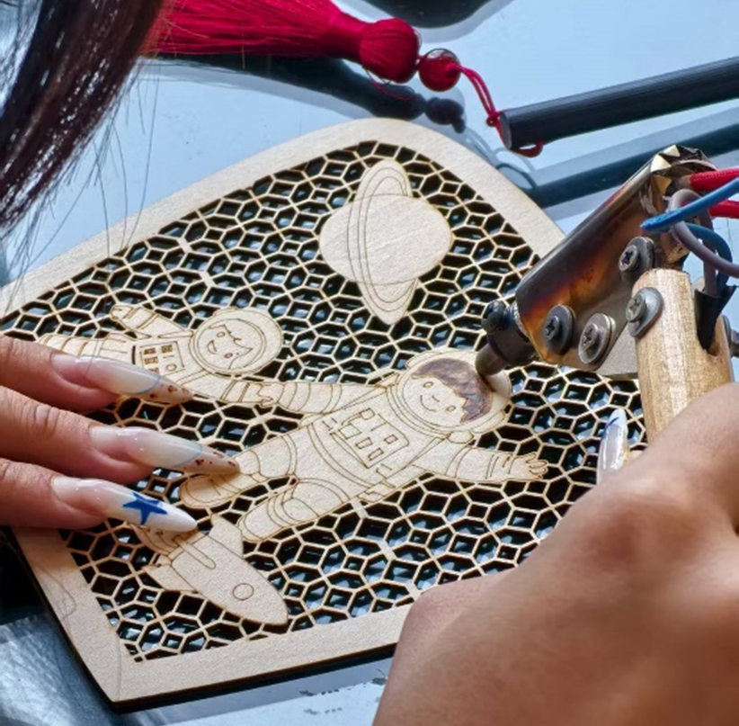 烫画十分讲究,苏扇风华实践团团员均参与体验,很容易就会烫焦,这对力度和温度的调控要求极高,烙铁温度需根据扇面材质和图案要求精准调节。温度过高,扇面易烧焦;温度过低,花纹则不清晰。除了烫焦扇子,花纹也深浅不一,下面这个是苏扇风华实践团其中一位的烫花的结果,苏扇风华实践团团员体验后普遍反映,烫花工艺对力度和温度的把控极具挑战,成品多出现花纹深浅不一或局部焦痕的情况,深刻体会到传统技艺的技术门槛。