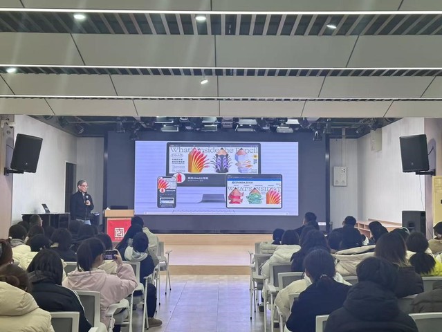 在互动环节,李根在还展示了他在国际设计平台上的评审经验与策展实践,鼓励同学们敢于突破学科边界,积极参与跨领域的创作与交流。他引用安迪·沃霍尔的名言——“每个人都会有十五分钟的成名时间”,激励在场同学珍视每一次表达的机会,在属于自己的创作时刻勇敢发光。