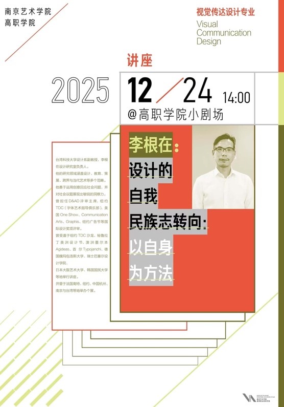 12月24日下午,台湾科技大学设计系副教授李根在老师为高职学院视觉传达设计专业师生带来了一场关于设计思维与自我表达的深度分享。讲座以“设计的自我民族志转向:以自身为方法”为主题,围绕设计如何从个人经验出发、与社会对话展开探讨。