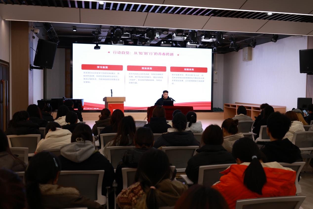 丛聪围绕青年团员的理想信念与行动自觉讲授专题团课,从“信念铸魂、艺展风采、知行合一”三个维度逐一展开。结合个人成长历程与国家发展需求,通过解读榜样事迹、分析成长路径,激励同学们在理论学习中涵养家国情怀,在专业钻研中锚定奋斗方向,在社会实践中砥砺初心使命,让青春理想与时代同频,用扎实的脚步书写无愧于信仰的人生篇章。 在 “知行合一” 篇章,丛聪着重强调行动自觉的重要性。他鼓励大家珍惜大学时光,积极参与社团活动、学科竞赛、社会实践,在探索中挖掘潜能,提升自我。